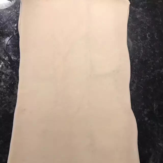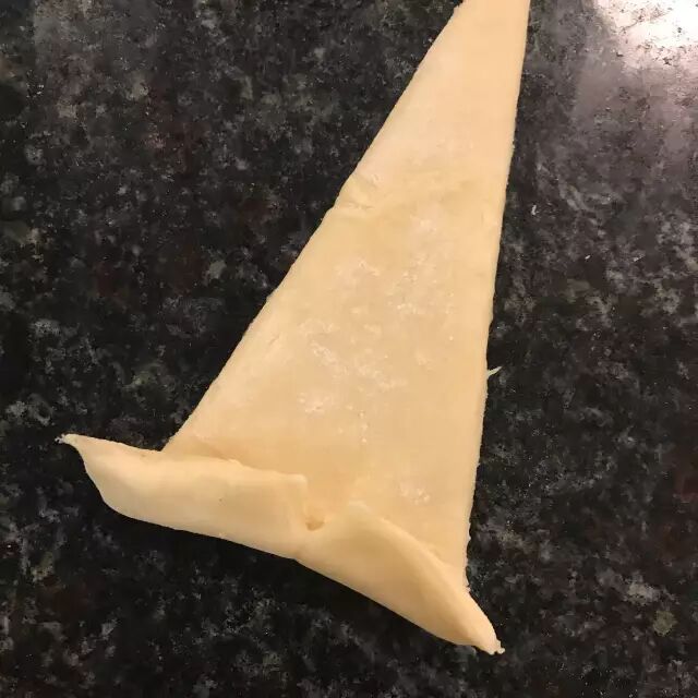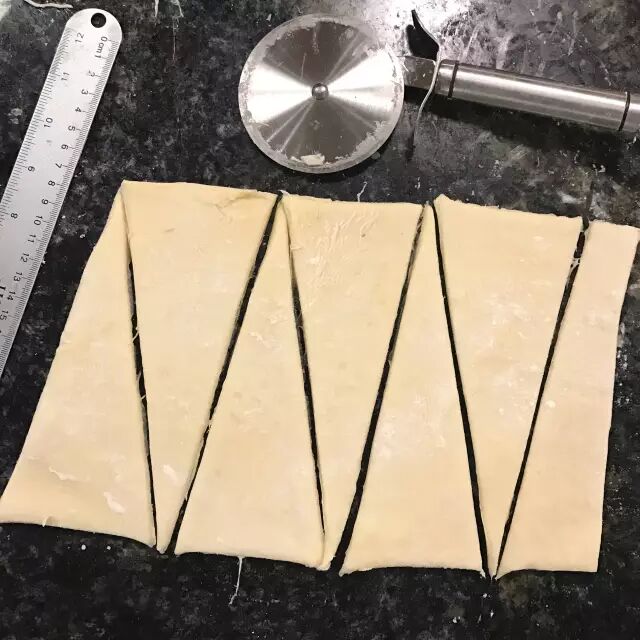 8. 将折好的面片擀至4mm厚,用刀修去不规整的边缘,切割成底边10cm,高25cm的等腰三角形;