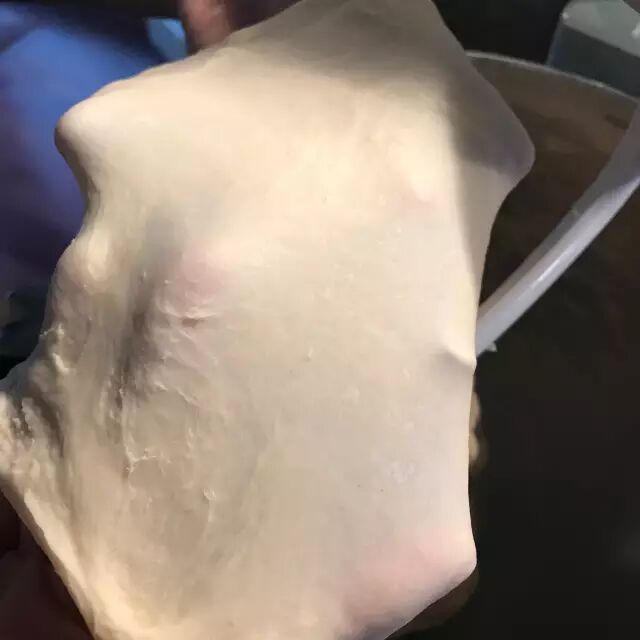 3. 加入黄油(揉面)继续揉至拓展状态,摊成片状,包上保鲜膜,放入冰箱冷冻30分钟;