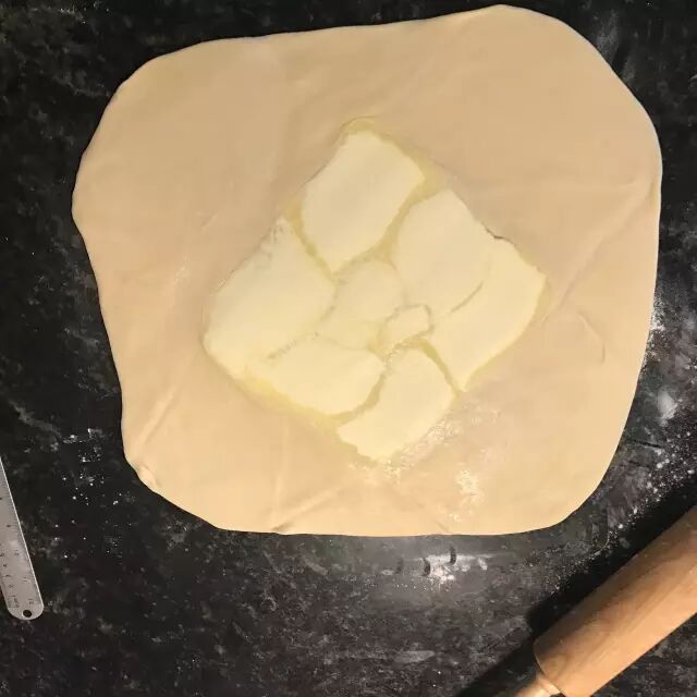 4. 将黄油用保鲜膜包起来,擀成方形片状,面团冻好后取出,擀至比黄油(裹入)大,把黄油(裹入)放在中间;