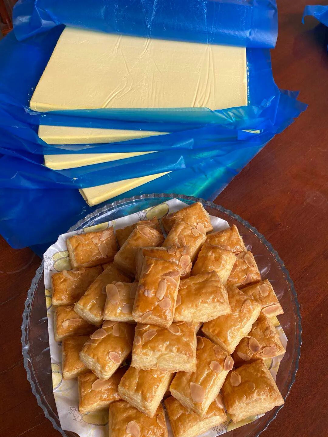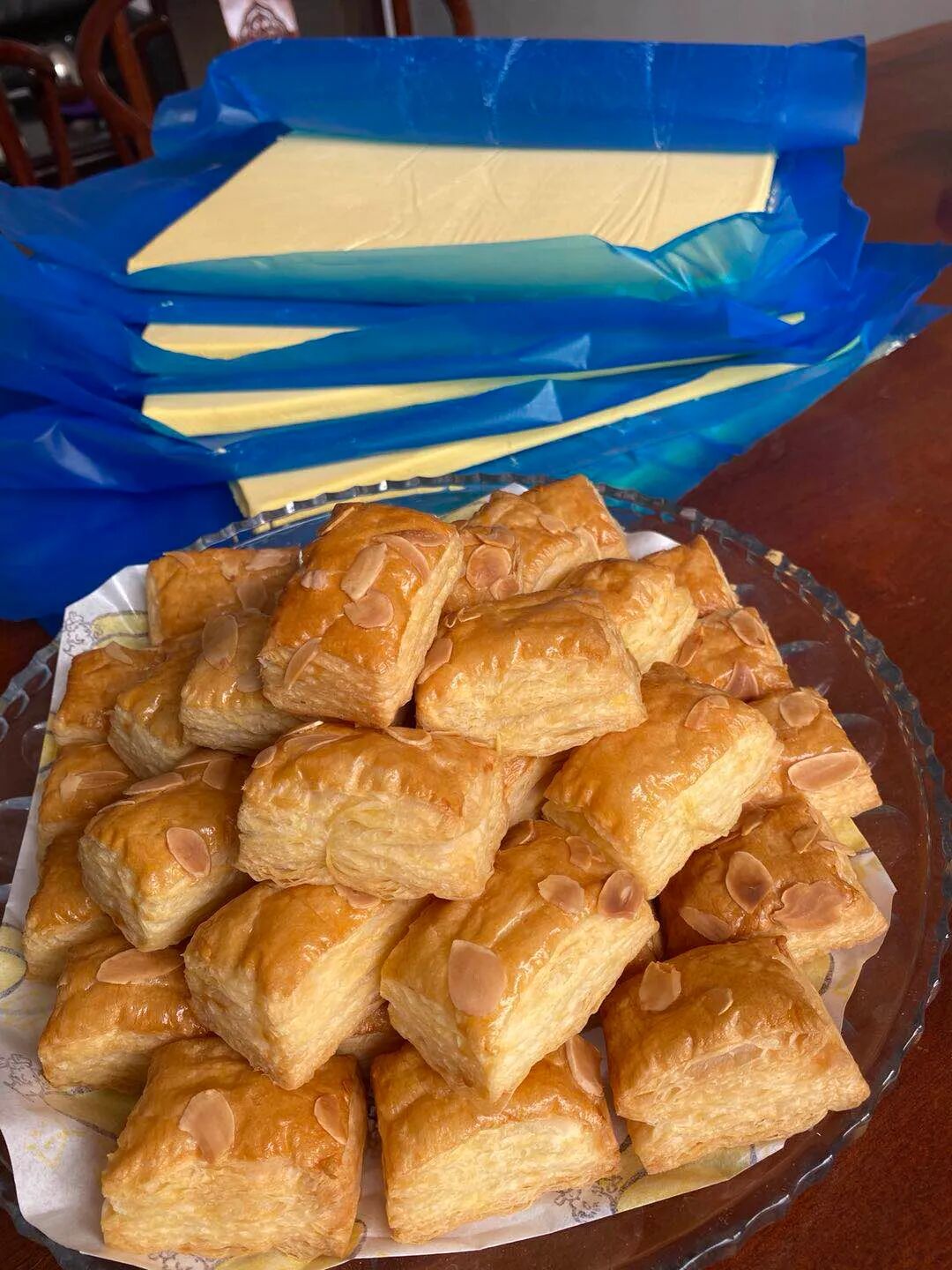面团是分层与黄油,卷叠连续多次,然后卷成一片,又被称之为层压。